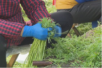 69岁的村民周熏陶一手握住一把芦蒿,另一只手拿着镰刀紧贴芦蒿根部,“快准狠”一刀割起,再抬手时,地面上仅残留芦蒿的根系。“这都是有讲究的,保留根系是为了不影响下茬芦蒿的上市,而且动作要轻,割的时候要掌握嫩度,刚好在手一掐就能断掉的程度是最好,能确保芦蒿新鲜水嫩。”