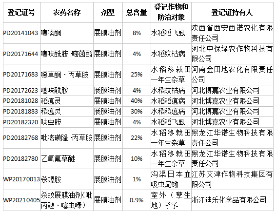 截至2023年7月31日,在我国有效登记的展膜油剂产品共有11个,涉及6个省份的7家生产企业,其中大田用农药9个(杀虫剂2个,杀菌剂4个,除草剂3个),卫生用农药2个。具体登记信息如下: