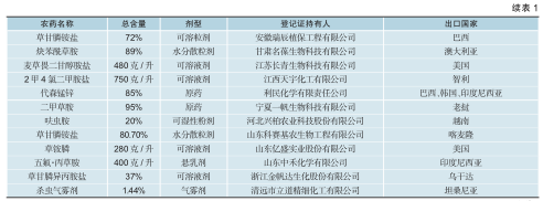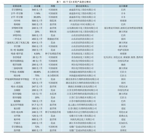 从EX农药上看,仅限出口的农药种类多,除草剂包括草甘膦钾盐、2甲·草甘膦、精草铵膦钠盐等;杀虫剂包括联苯菊酯、噻虫嗪、氯虫苯甲酰胺等;杀菌剂包括丙环唑、氟环唑、粉唑醇,等等。46个EX农药产品登记情况见表1。
