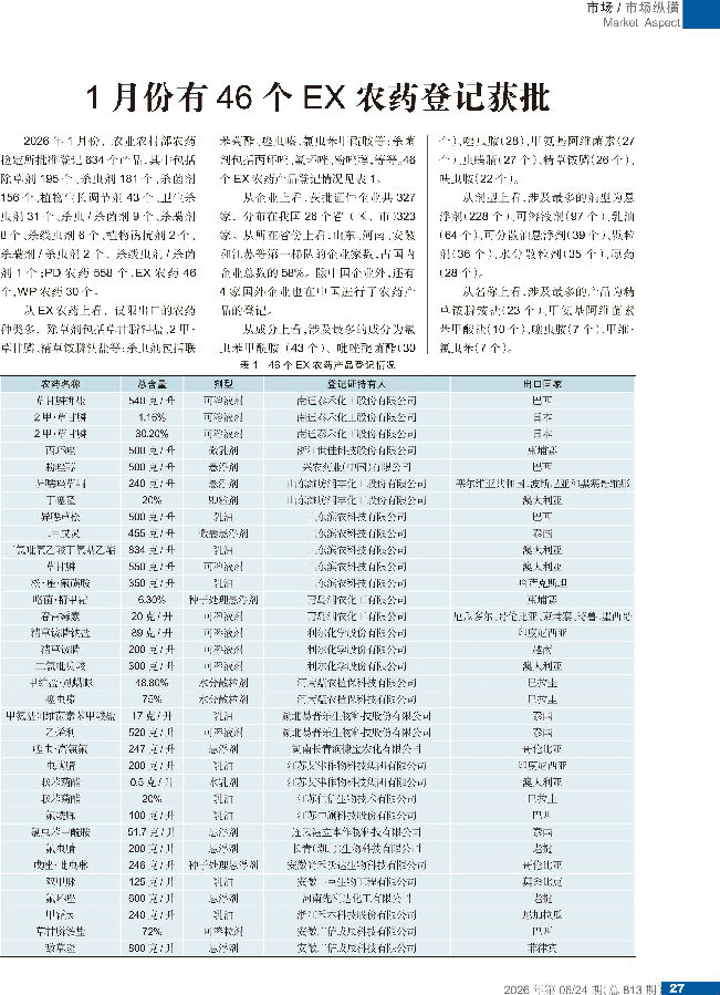 2026年1月份,农业农村部农药检定所批准登记634个产品,其中包括除草剂195个、杀虫剂181个、杀菌剂156个、植物生长调节剂43个、卫生杀虫剂31个、杀虫/杀菌剂9个、杀螨剂8个、杀线虫剂6个、植物诱抗剂2个、杀螨剂/杀虫剂2个、杀线虫剂/杀菌剂1个;PD农药558个,EX农药46个,WP农药30个。