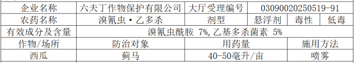 1月30日,农业农村部农药检定所公示了2026年第一批拟批准登记的农药产品名单。在公示的497个农药产品中,六夫丁作物保护有限公司(简称:六夫丁)行业首家登记的创新性产品——六夫丁威猛®(12%溴氰虫酰胺·乙基多杀菌素悬浮剂)赫然在列,中国杀虫剂产品实力再迎重磅升级!