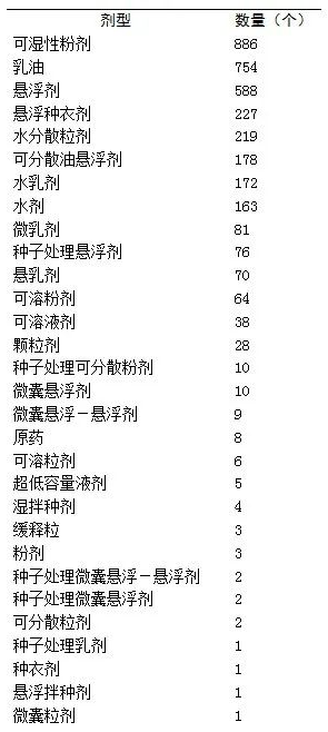 3620个登记产品中,涉及农药剂型共有38种(见表37),登记数量最多的为可湿性粉剂(WP)886个,占小麦登记总数的24.47%;接下来依次为乳油(EC)754个、悬浮剂(SC)588个、悬浮种衣剂(FSC)227个、水分散粒剂(WG)219个、可分散油悬浮剂(OD)178个、水乳剂(EW)172个、水剂(AS)163个、微乳剂(ME)81个、种子处理悬浮剂(FS)76个、悬乳剂(SE)70个,占比分别为20.82%、16.24%、6.27%、6.04%、4.91%、4.75%、4.50%、2.23%、2.09%、1.93%,其他剂型可溶粉剂(SP)、可溶液剂(SL)、颗粒剂(GR)、种子处理可分散粉剂(WS)、微囊悬浮剂(CS)、微囊悬浮-悬浮剂(ZC)、原药(TC)、可溶粒剂(SG)、超低容量液剂(UL)、湿拌种剂(WS)、缓释粒(BRG)、粉剂(DP)、种子处理微囊悬浮-悬浮剂、种子处理微囊悬浮剂(CF)、可分散粒剂(WJ)、种子处理乳剂(ES)、种衣剂(SD)、悬浮拌种剂(FSB)、微囊粒剂(CG)、湿粉(WF)、泡腾片剂(EB)、可溶性粉剂(SPX)、可分散液剂(DC)、缓释粒剂、干悬浮剂(DF)、干粉种衣剂(GZ)和干拌剂(GA)等合计占比5.7%。