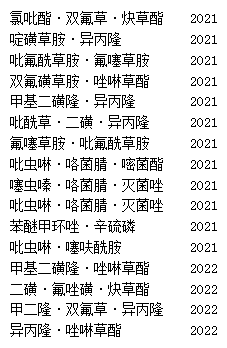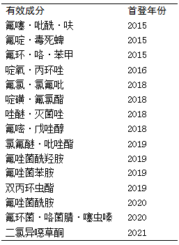表42 2015-2022年小麦上境外企业首登新化学农药品种和年份