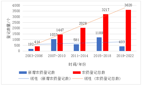 图4 2003-2022年我国小麦用农药登记数量变化情况