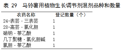 马铃薯用植物生长调节剂产品中,登记的有效成分有17种,其中单剂12种(见表28)、混剂5种,而混剂中24-表芸苔素内酯、28-高芸苔素内酯、萘乙酸、复硝酚钠、及22、23、24-表芸苔素内酯5种有效成分未以单剂形式在马铃薯上登记。登记的植物生长调节剂单剂集中在前5种有效成分,约占马铃薯用植物生长调节剂单剂登记总量73%。