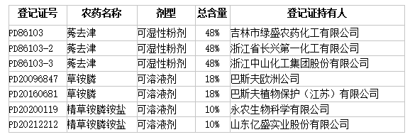 截至2024年6月10日,在我国葡萄园有效登记的除草剂产品共有7个,涉及国内外7个登记证持有人、莠去津和草铵膦2种有效成分。具体登记信息如下: