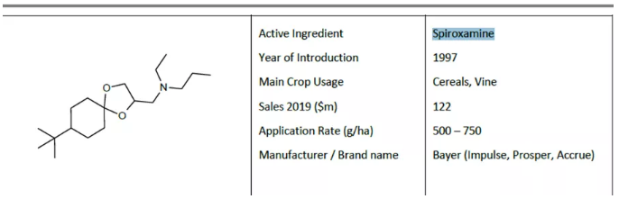 螺环菌胺是具有甾醇生物合成抑止作用的螺环缩酮胺类杀菌剂,对白粉病有保护和治疗作用。与吗啉类产品具有相似的作用机理而曾被归为吗啉类,对谷物的条锈病、叶锈病和喙孢菌有中等防治效果。2019年该产品在欧盟的登记有效期因评审进度缓慢而被推至至2023年12月。2005年在中美上市用在香蕉上,在欧洲,南非,加拿大,澳大利亚和以色列以商品名Prosper用在葡萄上。2010年住友英国子公司Interfarm在英国获批以Thyme为商品名的螺环菌胺加戊唑醇混剂。2015年拜耳于摩洛哥登记Soligur(螺环菌胺+丙硫菌唑+戊唑醇)用于防治谷物上的多种病害,在厄瓜多尔登记Impulse防治香蕉黑叶斑病。2017年Spirox在克罗地亚登记用于葡萄上。2018年拜耳在俄罗斯本土化生产谷物杀菌剂Falcon(戊唑醇+三唑醇+螺环菌胺)。