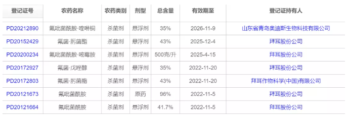 2012年11月5日首次在中国获得:96%氟吡菌酰胺原药农药登记和41.7%氟吡菌酰胺制剂农药登记,注册商标:路富达。截至目前,共有7个登记证,1个原药和6个制剂登记证,如下: