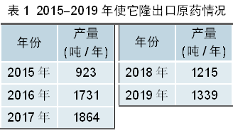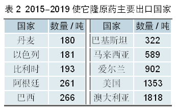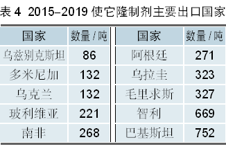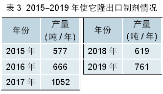 2. 制剂出口 制剂出口趋势与原药接近,2015-2019年我国制剂出口量共计3677吨,按照有效成分含量计折百原药数量约695吨,平均每年出口量在139吨左右(按折百原药计)。