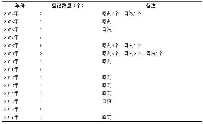 天津农药股份有限公司于1992年在我国首次临时登记高效氯氰菊酯母药(含量为27%),后陆续有原药/母药/母液产品进行登记,2004年开始有了原药产品正式登记,获得证件的高峰时间是2008年-2009年,达13个(有原药9个,母药3个,母液1个),2010年-2017年原药、母液产品有零星登记,2017年以后无原药/母药/母液产品登记。有效期内的高效氯氰菊酯原药/母药/母液产品的登记数量情况见表4。
