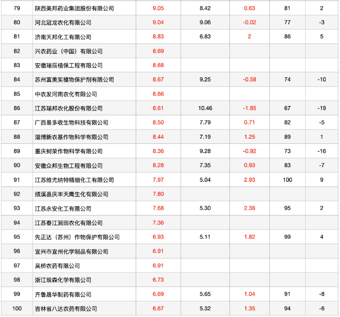 从增长幅度看,增长幅度超过50亿元的企业有:安道麦股份有限公司、安徽广信农化股份有限公司。