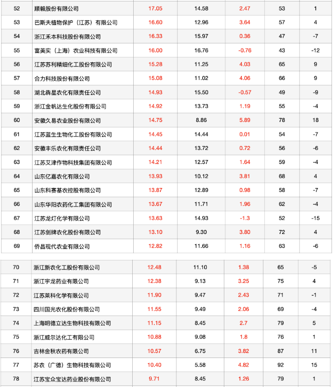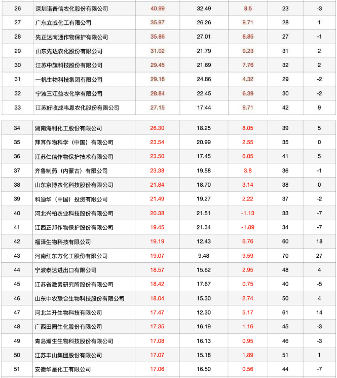 广东中迅农科股份有限公司销售额达41.43亿元,位居榜首,去年位列第二,增长了9.67亿元。深圳诺普信农化股份有限公司销售额40.99亿元,增长了8.5亿元。江西正邦作物保护股份有限公司销售额19.45亿元,继续位列第三。