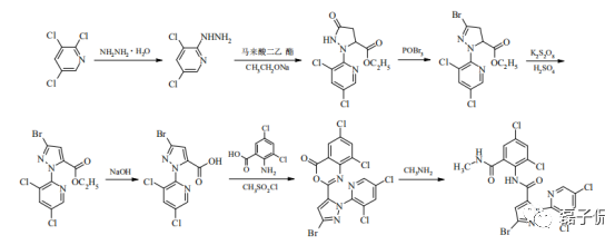 四氯虫酰胺以2,3,5-三氯吡啶为起始原料,经肼基化、合环、溴化、氧化、水解、酰氯化、缩合等7步反应制得目标产品。