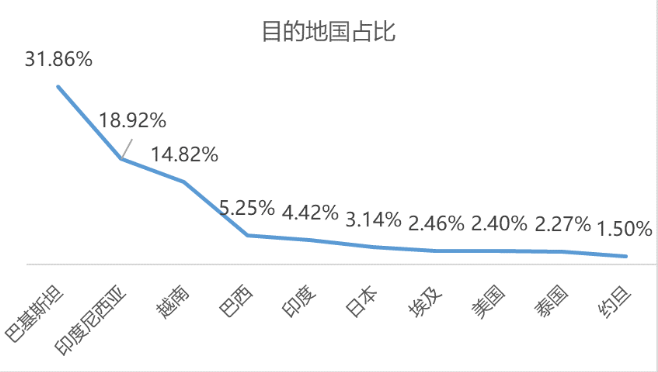 虫螨腈原药出口呈现逐年递增态势,95%虫螨腈原药出口占比53.23%,98%虫螨腈原药出口占比34.42%,96%虫螨腈原药出口占比11.71%,目的地排名前三的国家分别为:巴基斯坦、印度尼西亚和越南。