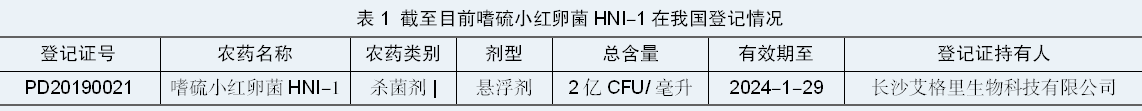 该产品目前在我国为独家登记,质量保证期为1年。嗜硫小红卵菌HNI-1悬浮剂仅长沙艾格里生物科技有限公司获得登记,该产品原有的登记作物和防治对象为水稻稻曲病、番茄根结线虫和花叶病。