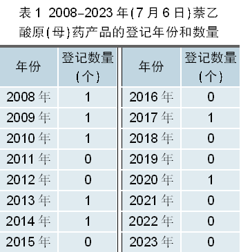 鹤壁全丰生物科技有限公司于1986年在我国首个登记萘乙酸母药(有效成分含量为80%),后陆续有零星的原药产品进行了登记,2006-2010年各登记1个(其中2个去临转正),时隔两年后的2013年、2014年各登记1个,2015年以后仅零星登记原药产品2个。2008-2023年(7月6日)有效期内的萘乙酸原(母)药产品的登记年份和数量见表1。