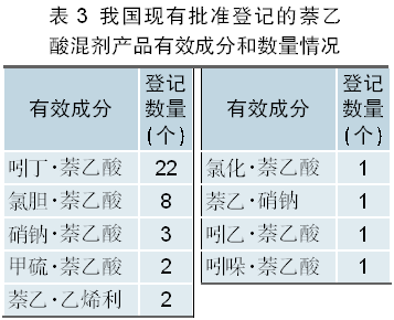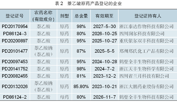 从登记作物来看,萘乙酸产品登记在26种栽培类型上,在水稻(含水稻秧田)上的登记数量是17个,名列第一,登记数量排在其后的是番茄13个,杨树、小麦(含冬小麦)各8个,后面是葡萄、姜和棉花各6个,紧接着苹果树和黄瓜各4个,甘薯、月季(含观赏月季)和马铃薯各3个,随后玉米、沙棘各2个,其余为谷子、花生、大豆、大蒜、洋葱、山药、荔枝树、菠萝、樱桃树、豆类、蔬菜、果树均为1个。其中有的萘乙酸生产企业在番茄、菠萝上进行了登记,也有的萘乙酸生产企业在棉花、樱桃树、苹果树上进行了登记,还有的萘乙酸生产企业在苹果树、葡萄上进行了登记;有的吲丁·萘乙酸生产企业在杨树、水稻或黄瓜上进行了登记,有的吲丁·萘乙酸生产企业在杨树、水稻、玉米上进行了登记;有的吲乙·萘乙酸生产企业在小麦、沙棘、花生上进行了登记,有的氯胆·萘乙酸生产企业在大蒜、姜、山药、洋葱上进行了登记,等等。