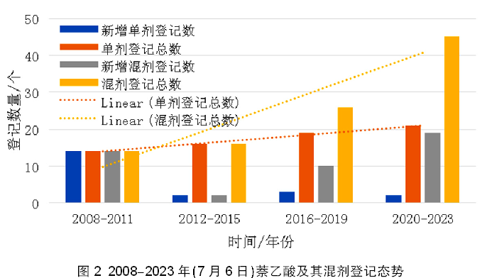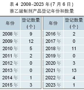 从登记数量来看,萘乙酸登记产品共66个,有单剂25个,混剂9种41个(见表3);低毒58个,微毒8个。相比单剂登记,混剂的数量较多,均为二元复配制剂。1993年河南省快丰收植物制剂有限公司首先获得萘酸·硝制剂的临时登记,登记的产品为2.85%水剂。制剂登记数量总体呈上升态势,登记数量从2009年起显著增加,攀升到22个,后产品登记进行了多次回调,2020年后产品登记再次进入小幅上升通道。2008-2023年(7月6日)萘乙酸制剂产品登记年份和数量见表4。