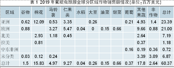 从区域分布来看,氟啶虫酰胺目前全球市场主要分布于2个主要的市场(亚洲和欧洲)。亚洲:主要用于棉花,其次是水果、蔬菜、仁果类;欧洲:主要用于水果、蔬菜,其次是仁果类、马铃薯;北美:水果、蔬菜、棉花均有涉及。拉美:主要用于棉花;中东非洲:相对来说,使用不是很广,主要是非作物上的使用。(见表1)