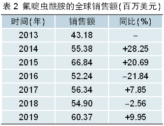 据预测,氟啶虫酰胺年销售额至少达0.50亿美元,现如今这个目标早已实现。2019年,氟啶虫酰胺的全球销售额为6037万美元,2013-2019年的销售额复合年增长率为5.9%。