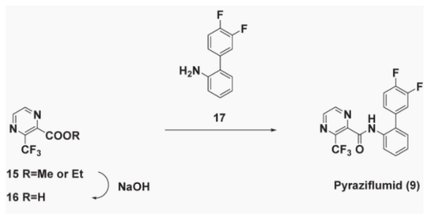 联苯吡嗪菌胺(pyraziflumid)的合成路线:3-(三氟甲基)-2-吡嗪甲酸甲酯(15)[3-(trifluoromethyl)-2-pyrazine carboxylic acid ester] 与 3',4'-二氟-2-苯胺(17)反应或3-(三氟甲基)-2-吡嗪甲酸(16)和3',4'-二氟-2-苯胺(17)缩合而成(如下图所示)。