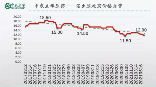从中农立华原药价格指数图可以看出,除2017年原药价格大幅度上涨外,噻虫胺的价格是呈现出稳步下滑的趋势,最高18.5万元/吨,最低11.5万元/吨,目前市场实际成交价格在12万元/吨,已处于近五年来的相对价格低点。