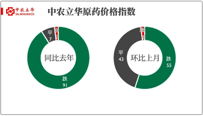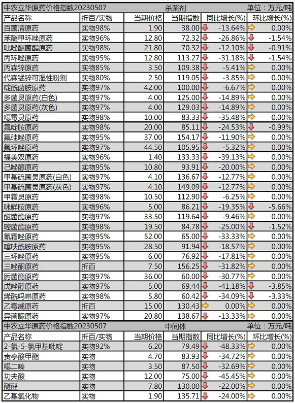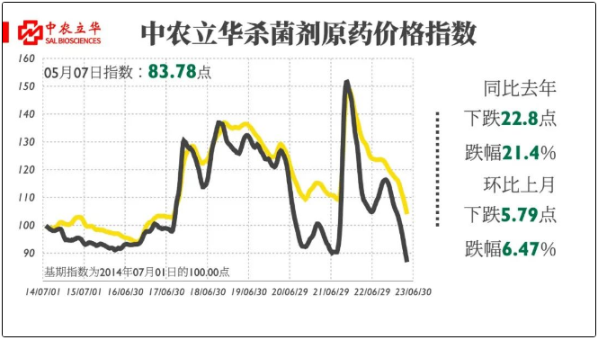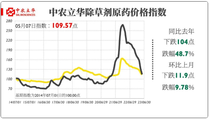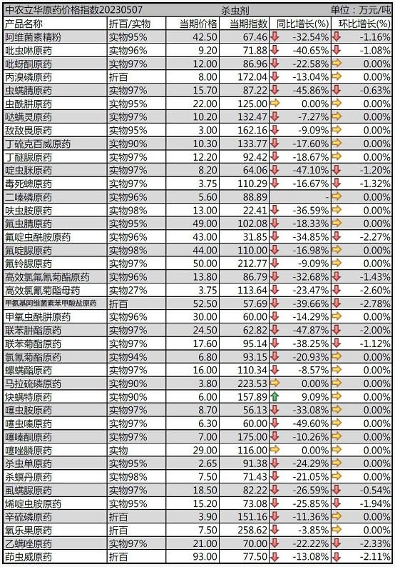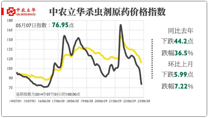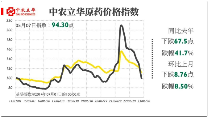 2023年5月7日,中农立华原药价格指数报94.30点,同比去年大跌41.7%,环比上月下跌8.50%,除草剂、杀虫剂、杀菌剂市场行情仍继续走低。跟踪的上百个产品中,同比去年,91%产品下跌;环比上月,上涨品种很少,55%产品走低。