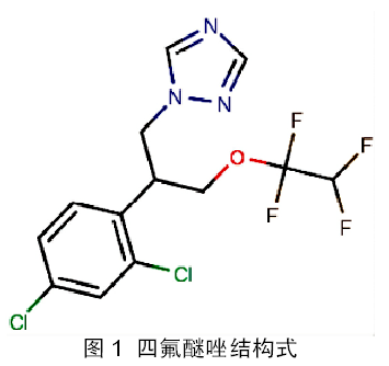 四氟醚唑又名氟醚唑,ISO通用名称:Tetraconazole,化学名称:(RS)-2-(2,4-二氯苯基)-3-(1H-1,2,4-三唑-1-基)丙基1,1,2,2,-四氟乙基醚,CAS登录号:112281-77-3,分子式:C13H11Cl2F4N3O,结构式见图1,相对分子量:372.15。四氟醚唑纯品为无色粘性液体,原药为淡黄色粘稠油状物,难溶于水,易溶于丙酮、甲苯等有机溶剂;大鼠急性经口LD50为1248mg/kg(雄),1031mg/kg(雌),急性经皮LD50>为2000mg/kg,根据我国农药毒性分级标准,属于低毒品种。