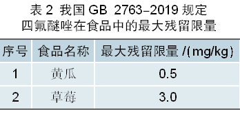 从表2可以看出,我国目前仅制定了四氟醚唑在黄瓜和草莓等2种食品(食用农产品)中的最大残留限量。