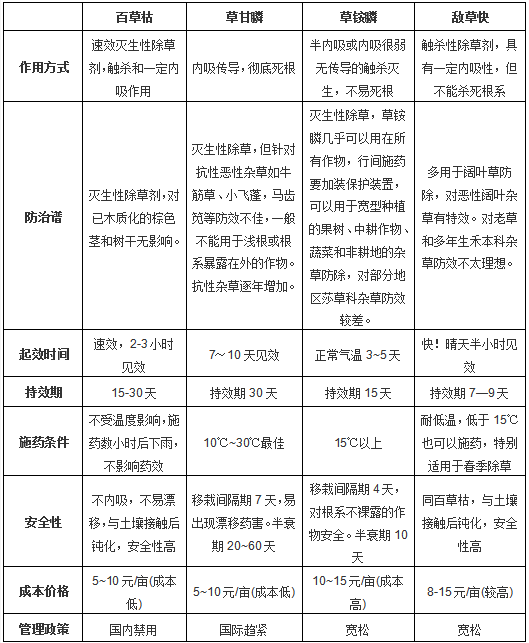 灭生性除草剂主要包括:百草枯、草甘膦、草铵膦、敌草快。几种除草剂的作用比较如下: