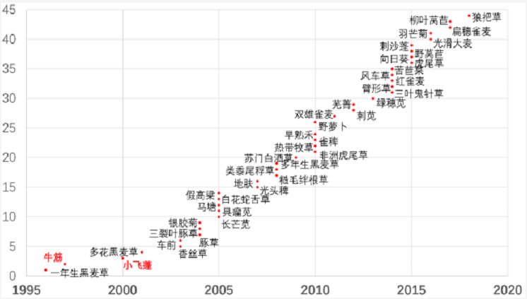 世界除草剂抗性行动委员会对草甘膦产生抗性杂草的统计
