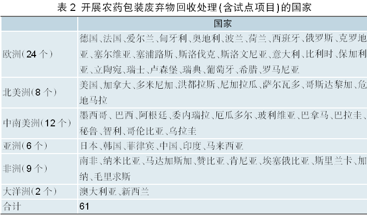 初步统计,全球有61个国家开展了农药包装废弃物回收处理项目(表2)。从国外经验看,较为普遍的做法是,由农药包装物回收处置项目的组织者在全国设置收集点,有些收集点依托经销商建立。农民将充分清洗后的农药包装物定期交到收集点,收集点与第三方机构签订协议,由第三方机构负责运输处置,开展再利用或焚烧处理等。