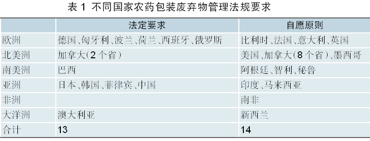 在农药包装废弃物管理立法方面,有的国家有专门的法律要求,有的国家则按照自愿原则管理(表1),且在欧洲、北美、大洋洲、南美、亚洲等地区2种情况均存在,没有显著规律。
