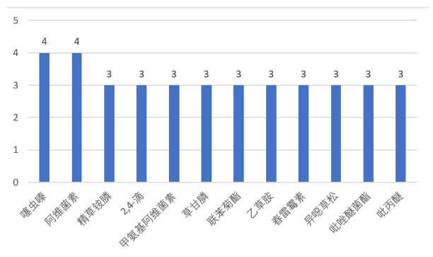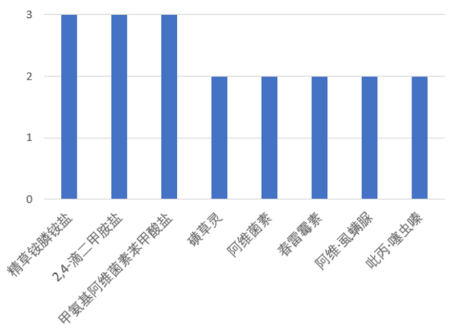 从有效成分来看,涉及最多的有效成分为噻虫嗪和阿维菌素,各为四项,其后为精草铵膦、2,4-滴、甲氨基阿维菌素等。