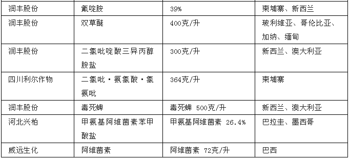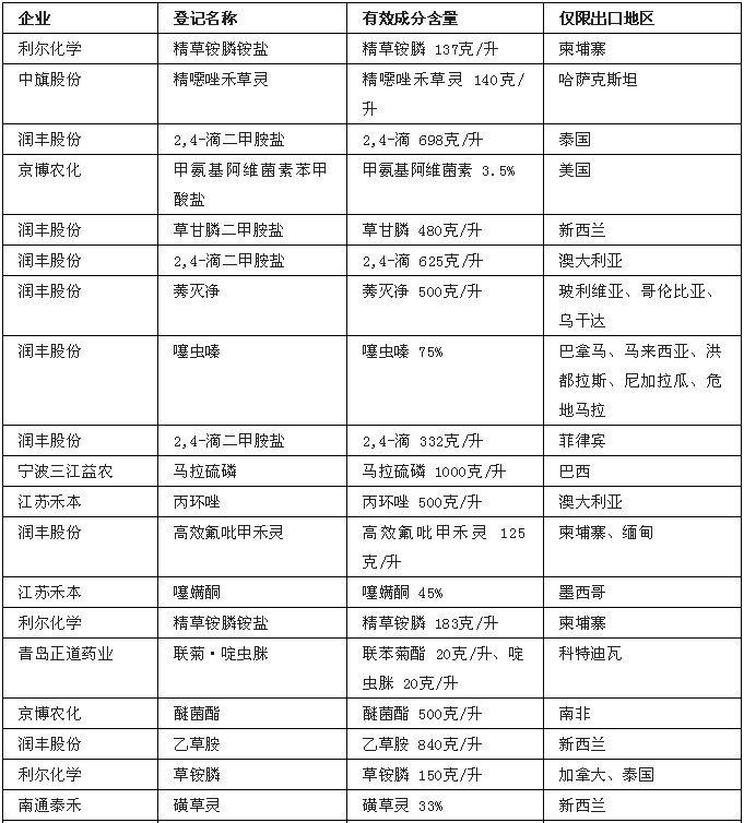 在获登的75项产品中,有31项为仅限出口登记,其中山东潍坊润丰化工股份有限公司获得了15项仅供出口登记。