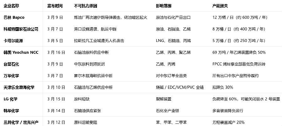 自2月28日伊朗关闭霍尔木兹海峡以来,全球已有12家大型炼化与化工企业宣布不可抗力,涉及产能超1200万吨/年,主要集中在中东和亚洲地区: