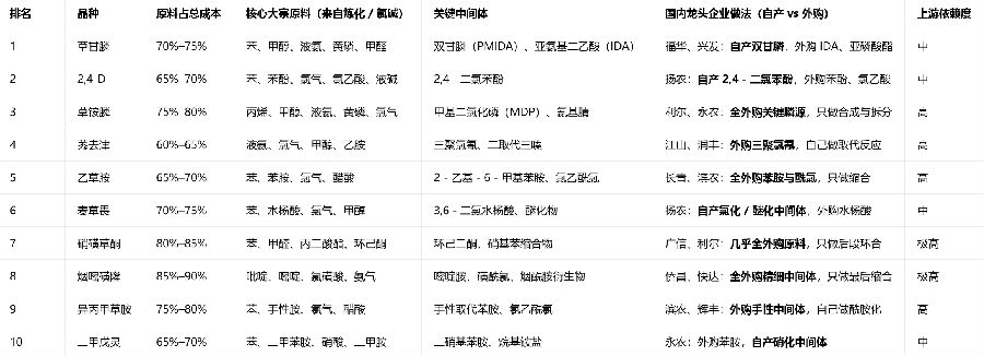 这里,我来粗浅的分析一下世界前十大除草剂的原材料情况。