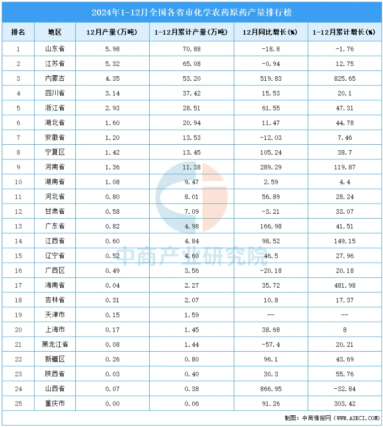 据中商产业研究,2024年1~12月全国化学农药原药产量367.5万吨,同比增长22.2%。其中,2024年1~12月山东省化学农药原药产量排名第一,累计产量为70.88万吨。