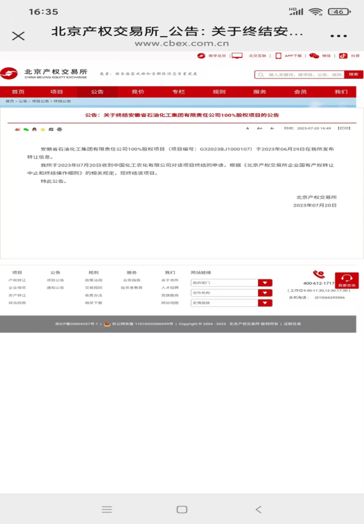 【情况说明】关于安徽石化2023年公开挂牌转让失败的相关情况