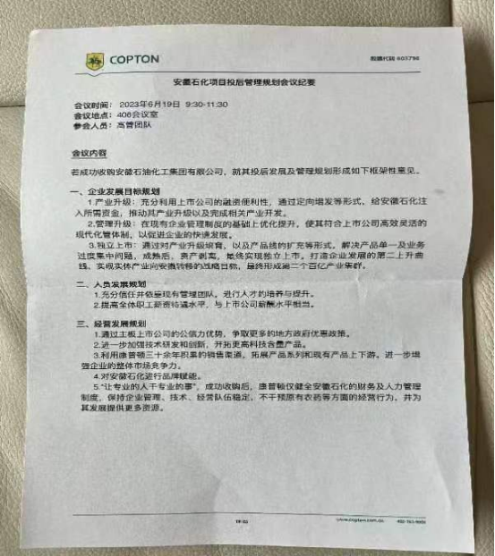 在2023年3月21日北交所预挂牌后,具有石油产品生产背景的上市公司康普顿(603798)提出拟收购安徽石化,并积极与中国农化和安徽石化接洽。由于安徽石化当时管理团队自组联合体筹集的资金未达到挂牌价格,中国农化负责人亲自到康普顿总部进行了洽谈,康普顿收购团队与安徽石化就收购事宜行了互访对接: