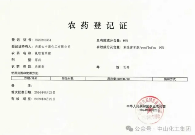 国内企业首证!中山化工集团氟唑菌苯胺原药获批下证