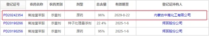 近期,浙江中山化工集团子公司内蒙古中高化工有限公司氟唑菌苯胺原药获批下证,这是除拜耳公司国内氟唑菌苯胺原药唯一证件。氟唑菌苯胺主要做种子处理剂,是一种内吸、预防和治疗作用的SDHI抑制剂。