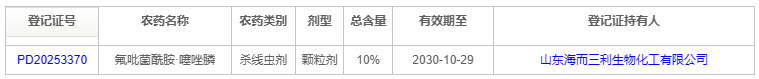 近日,新一批农药产品登记出炉,AgroPages世界农化网关注到,氟吡菌酰胺杀线虫剂方向再获登1项混配方案登记,由山东海而三利生物化工有限公司申请的10%氟吡菌酰胺·噻唑膦颗粒剂正式获批登记,用于萝卜(保护地)根结线虫防治。