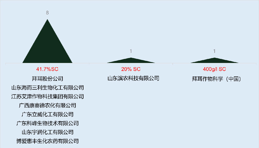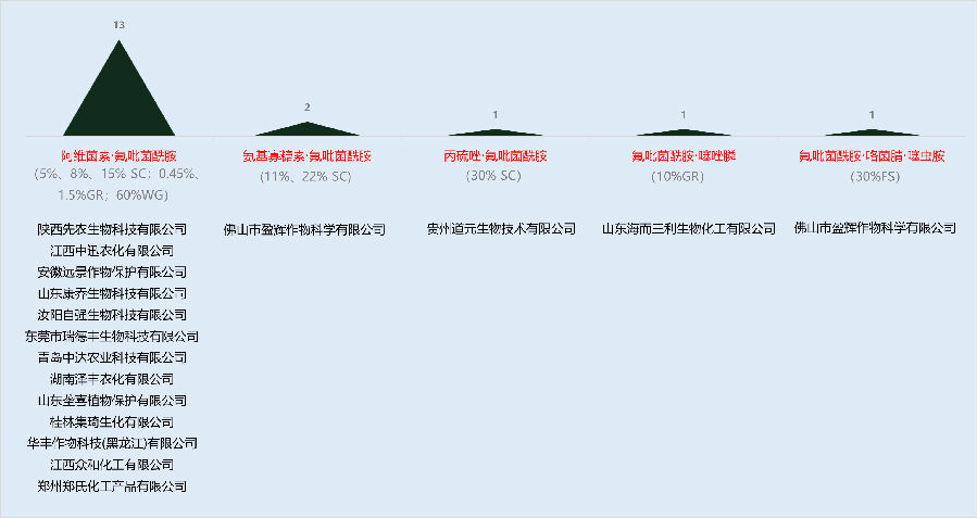 其中,登记的单剂产品以41.7%氟吡菌酰胺悬浮剂为主,但与拜耳开创性同类产品数十种适用作物及对应防治靶标相比,中国本土企业登记的41.7%氟吡菌酰胺悬浮剂的应用作物和靶标明显单一,绝大多数仅登记一种作物的一种防治对象。