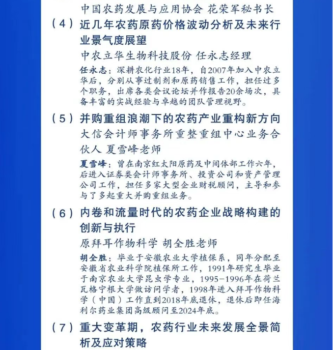 12月11-13日在江苏南通市举办的2025第十届中国农药市场年度峰会将邀请大信会计师事务所重整重组中心业务合伙人夏雪峰老师做报告分析,聚焦农药企业并购重组与债务纾困,以市值管理为核心视角,构建一套兼具理论与实操的完整解决方案。