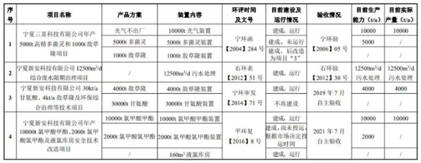 宁夏新安科技有限公司位于宁夏平罗工业园区,其前身为宁夏三喜科技有限公司,成立于2006年,2010年公司重组成为浙江新安化工集团股份有限公司的控股子公司,更名为“宁夏新安科技有限公司”,主营光气系列产品,现有装置产能为10000t/a光气(均自用不外售)4000t/a敌草隆、5000t/a多菌灵、10000t/a氯甲酸甲酯、2000t/a氯甲酸氯甲酯。以上装置中,由于近年来受化工行业市场行情影响,多菌灵装置自2016年停产至今,氯甲酸氯甲酯装置自建成后一直未开车,目前稳定运行的装置为10000t/a光气、4000t/a敌草隆、10000t/a氯甲酸甲酯。宁夏新安科技有限公司共备案建设项目6个,其中4个建设完成,2个在建。
