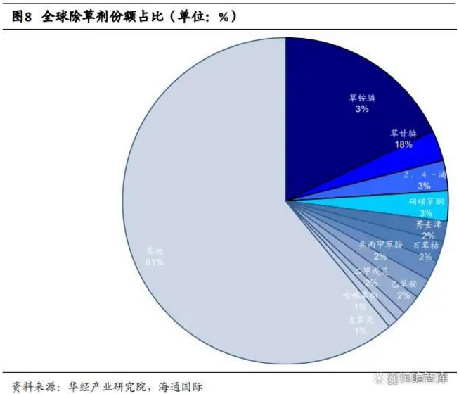 目前泛用性最大的除草剂为草甘膦,约占全球除草剂市场份额的18%,第二的草铵膦就仅占全球市场的3%,其余农药占比较小,由于草甘膦等农药其主要作用于转基因作物。其余一些非转基因作物生产需求的除草剂大部分占比不到1%,所以除草剂市场的集中度较低。目前全球二甲戊灵的市场需求量超过4万吨,平均价格预估在5.5万元/吨,市场销售额大约为4亿美金,约占全球除草剂市场规模的1-2%,由于未来可以用作替换其他有害除草剂,成长空间大,市场规模有望翻倍。