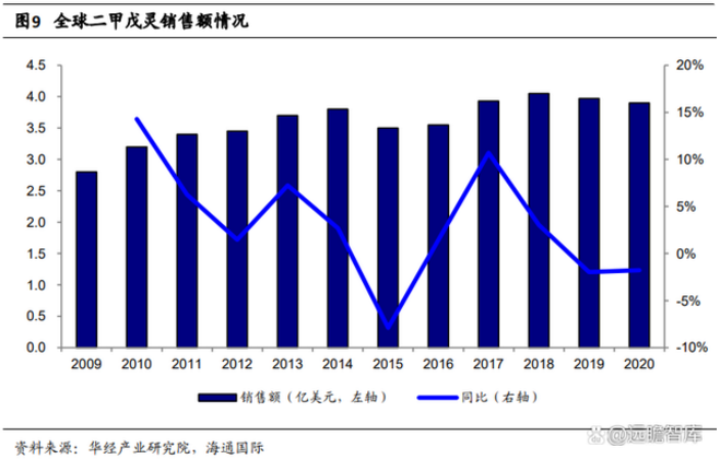 2019 年二甲戊灵全球销售额为3.97亿美金,是全球的第十二大除草剂单体。据统计,分地区来看,欧洲是二甲戊灵最重要消费市场之一,占全球份额28.47%;亚洲占27.32%,主要销售国家为印度、中国和日本;美洲地区主要集中在美国、巴西、哥伦比亚、厄瓜多尔等地;中东及非洲销售额较小。2003年,二甲戊灵全球销售额为2.25亿美元,2017年为3.93亿美元。2003年至2017年的复合年增长率为4.06%。