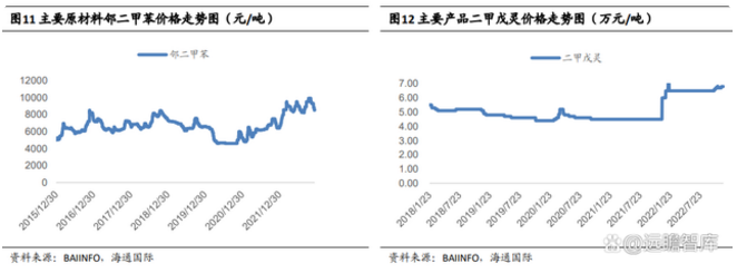 二甲戊灵年均价格较为稳定,不含税价格基本在4万元以上。2022年以来,受巴斯夫及印度生产受限等因素扰动,国内二甲戊灵原药价格持续走高,据统计,截至2022年10月23日,二甲戊灵原药价格提升至6.7万元/吨。