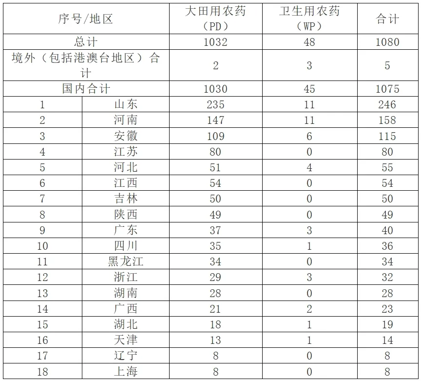 2025年1-3月,农业农村部共新颁发农药登记证1080个(不含仅限出口登记、变更登记和续展登记产品登记证),其中大田用农药(登记证号PD20243353-PD20243536、PD20250001-PD20250850)1032个,卫生用农药(登记证号WP20240139-WP20240143、WP20250001-WP20250043)48个。